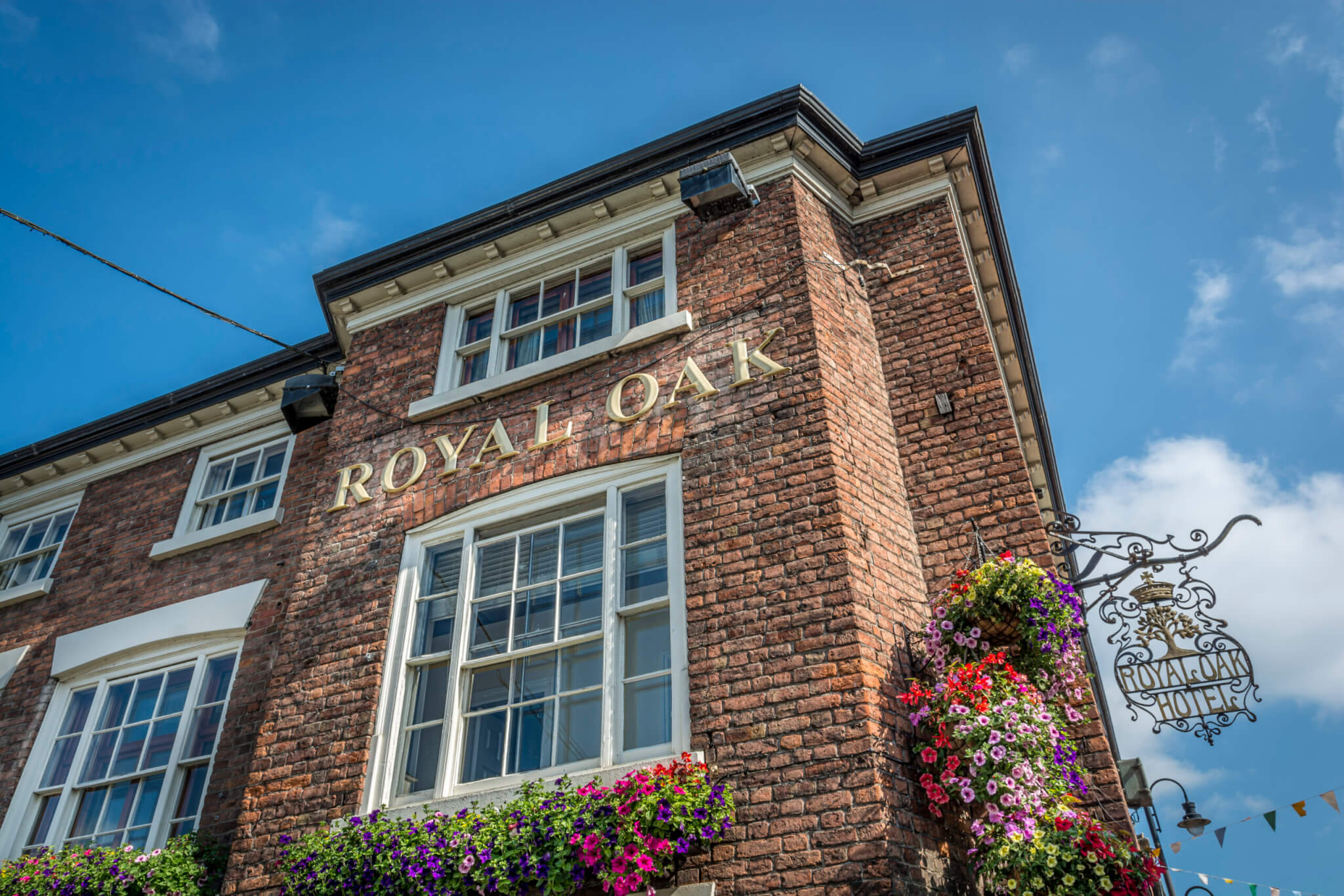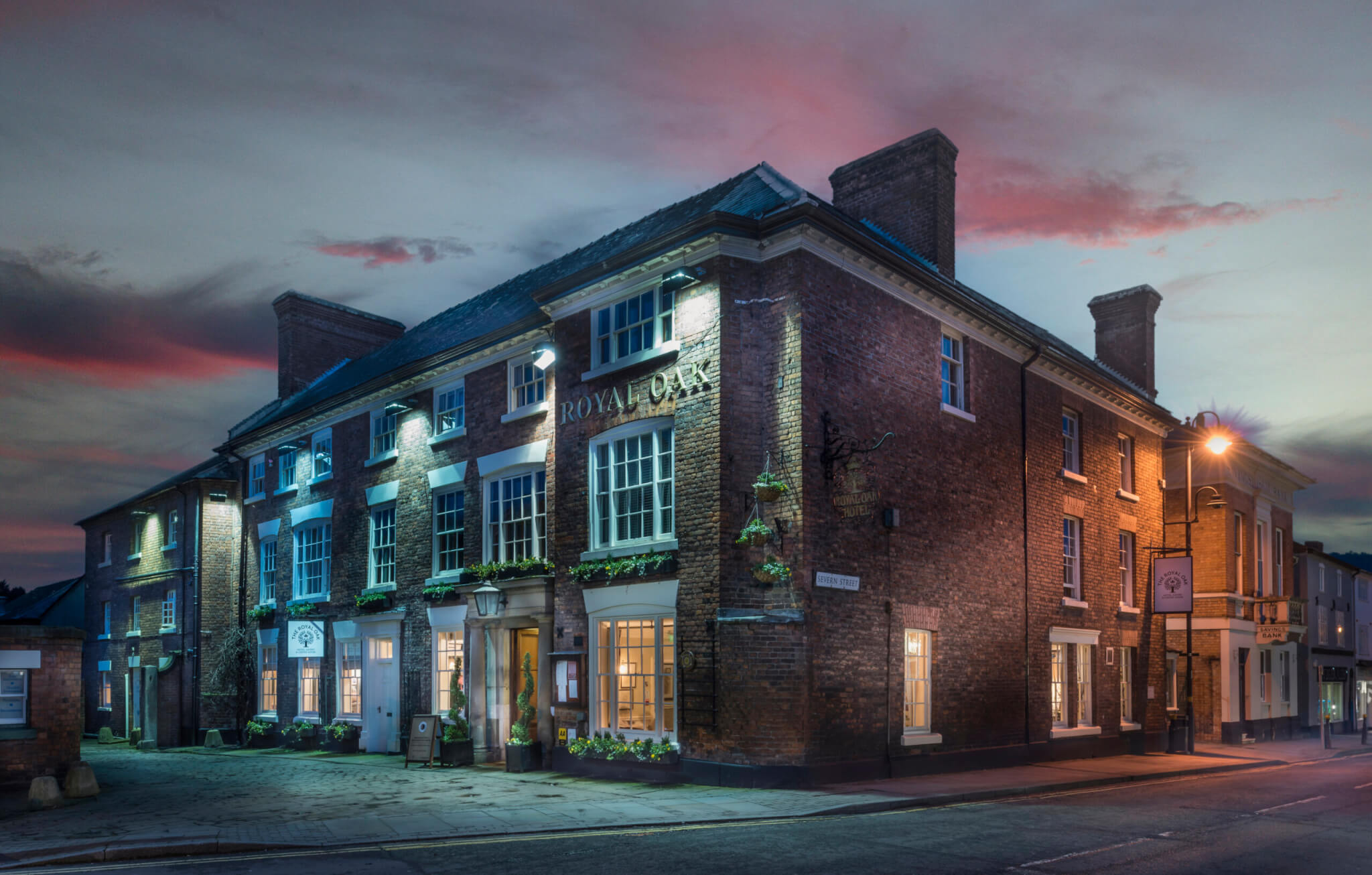 The Royal Oak in Welshpool stands with quiet authority at the gateway to Wales, a fine Georgian coaching inn that once welcomed travellers and tradesmen alike. With its elegant red-brick façade, sash windows, and timbered charm, it reflects the proud heritage of the Marches. Inside, a bustling bar and elegant dining spaces serve hearty local Welsh and English fare, while restful rooms blend classic comfort with modern flair. It remains a splendid stop, rooted in history, rich in hospitality, and steeped in the timeless charm of the borderlands.